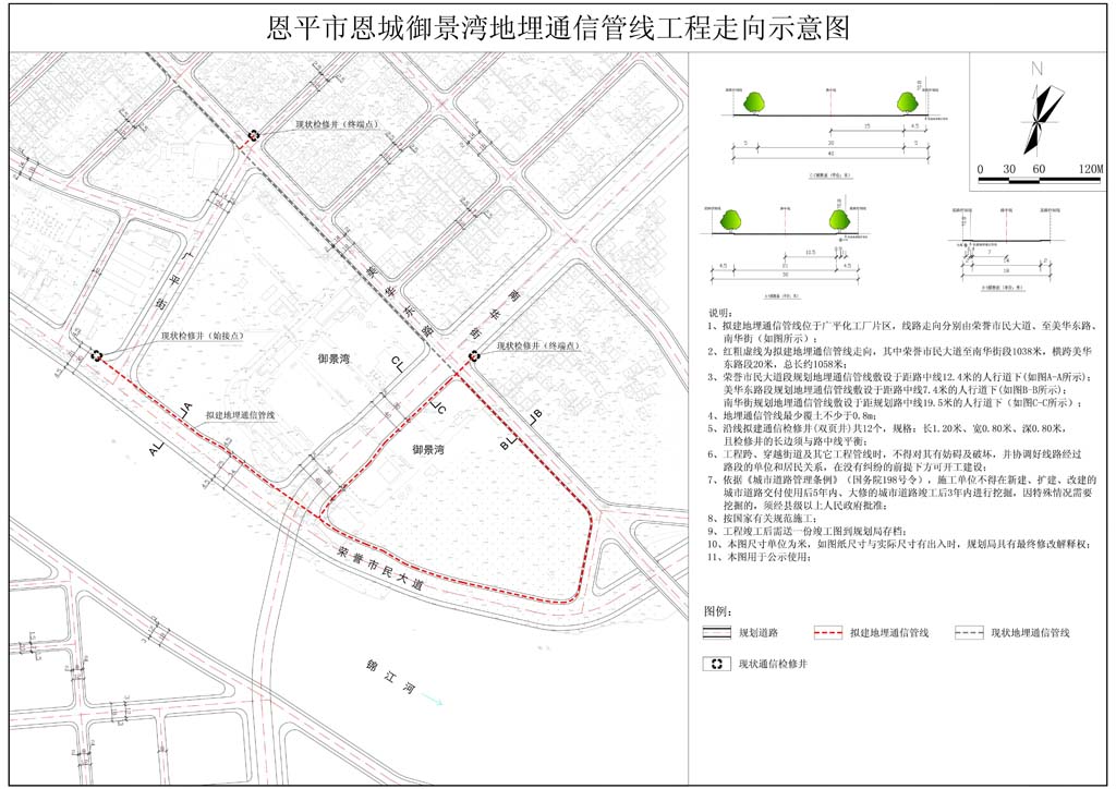 該項目位于廣平化工廠片區(qū),線路走向分別分別由榮譽市民大道、至美華東路、南華街。擬建地埋通信管線分為兩段,其中榮譽市民大道至南華街段1038米,由榮譽市民大道現(xiàn)狀通信檢修井始接,沿榮譽市民大道、美華東路至南華街;橫跨美華東路段20米,由位于美華東路的現(xiàn)狀通信管線始接,跨越道路至現(xiàn)狀通信檢修井;總長約1058米,沿線擬建通信檢修井(雙頁井)共12個,其規(guī)格:長1.20米、寬0.80米、深0.80米;且通信檢修井的長邊須與路中線平衡(如圖所示)。