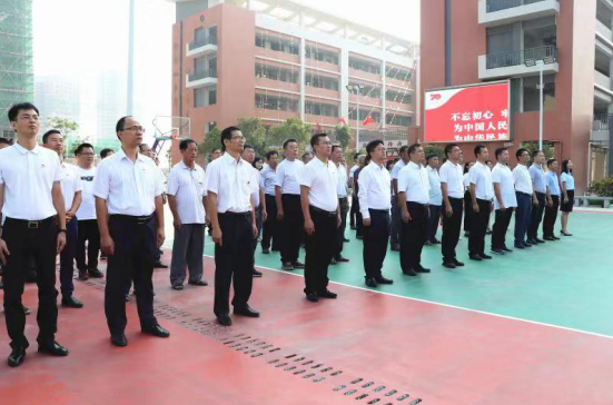 10月1日上午,為慶祝中華人民共和國(guó)成立70周年,深入貫徹落實(shí)黨的十九大精神,進(jìn)一步強(qiáng)化愛(ài)國(guó)意識(shí),園區(qū)黨工委副書記、管委會(huì)副主任,鎮(zhèn)委副書記、鎮(zhèn)長(zhǎng)陳偉民帶領(lǐng)班子成員、中層干部以上干部、各基層黨組織書記以及馮如小學(xué)師生代表共80多人在馮如小學(xué)操場(chǎng)舉行升國(guó)旗儀式。
