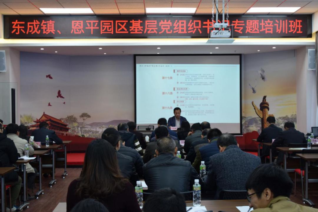 為貫徹落實《廣東省加強黨的基層組織建設(shè)三年行動計劃(2018-2020年)》,著力推進基層黨組織“頭雁”工程,提升基層黨組織書記綜合能力。1月17日下午,東成鎮(zhèn)、恩平園區(qū)在泉林黨群服務(wù)中心舉辦基層黨組織書記專題培訓(xùn)班,副市長,恩平園區(qū)黨工委書記、管委會主任,東成鎮(zhèn)委書記岑安林進行專題授課。東成鎮(zhèn)、恩平園區(qū)部分班子成員及基層黨組織書記共50多人參加。