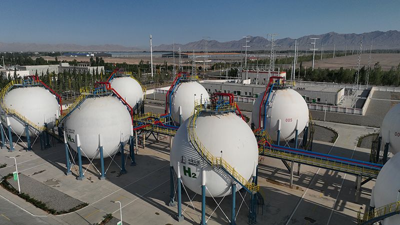 這是2023年6月30日拍攝的中國石化新疆庫車綠氫示范項(xiàng)目制氫廠儲氫罐區(qū)(無人機(jī)照片)。新華社記者 顧煜 攝