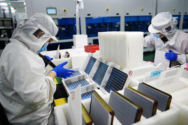 2023年6月17日,在陽光中科(福建)能源股份有限公司,工人在高效太陽能電池車間工作。該公司位于福建泉州南安市,是國家級綠色工廠企業(yè),無塵自動化生產(chǎn)線日產(chǎn)太陽能電池80萬片。新華社記者 劉勇貞 攝