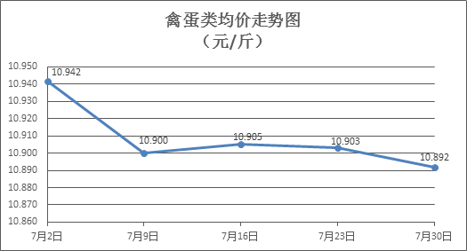 禽蛋類商品價格微幅盤整。上周所監(jiān)測的6種禽蛋類商品價格波動情況為3漲3跌,綜合零售均價為10.892元/斤,環(huán)比下降0.11%。其中:白條雞、白條鴨零售均價分別為每斤19.67元、15.40元,環(huán)比分別下降0.71%、上漲0.26%;白殼雞蛋、鴨蛋零售均價分別為每斤6.62元、7.93元,環(huán)比分別上漲0.15%、下降0.13%。