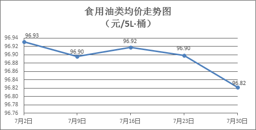 食用油類商品價格總體略降。上周所監(jiān)測的9種食用油(5L裝)商品價格波動情況為1漲4跌4平,綜合零售均價為96.82元/桶,環(huán)比下降0.08%。其中:金龍魚花生油、金龍魚調(diào)和油零售均價分別為每桶105.41元、71.07元,環(huán)比分別下降0.27%、持平。