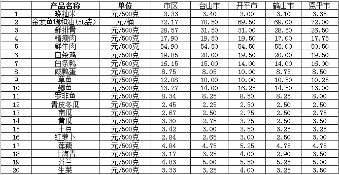 說明:1、表中價格為該地區(qū)監(jiān)測點(diǎn)綜合平均價;2、“市區(qū)”含蓬江區(qū)、江海區(qū)、新會區(qū),價格分別采自蓬江市場、江南市場、城東市場等13家農(nóng)貿(mào)市場;3、其他四個縣市價格分別采自新華市場、錦江市場等8家農(nóng)貿(mào)市場。