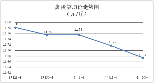 禽蛋類商品價(jià)格略有下降。所監(jiān)測(cè)的5種禽蛋類商品價(jià)格波動(dòng)情況為2漲3跌,綜合零售均價(jià)為每斤11.67元,環(huán)比下降0.38%。其中:白條雞、白條鴨零售均價(jià)分別為每斤20.57元、15.22元,環(huán)比分別上漲0.49%、下降0.13%;雞蛋、鴨蛋零售均價(jià)分別為每斤6.21元、7.16元,環(huán)比分別下降1.11%、下降3.24%。