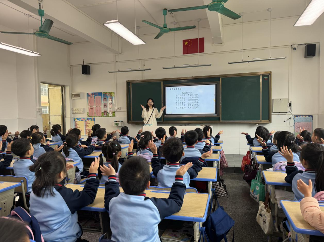 隨后,全體學生齊聲唱響《誠信拍手歌》?!澳闩囊?,我拍一,別人玩具不亂拿……”清脆響亮的歌聲伴隨著歡快有力的拍手節(jié)奏,在校園上空久久回蕩。學生們精神抖擻,臉上洋溢著純真笑容,用充滿朝氣的歌聲傳遞著對誠信的堅定信念。緊接著,誦讀誠信歌謠環(huán)節(jié)將活動推向高潮。各班學生以飽滿的熱情、富有感染力的語調(diào),誦讀著一首首精心創(chuàng)作的誠信歌謠,或激昂奮進,或娓娓道來,將誠信的真諦融入每一句詩詞之中。