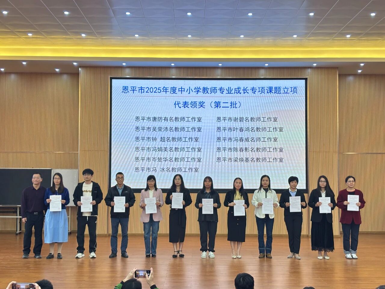 活動(dòng)伊始,恩平市教師發(fā)展中心副主任盧惠賢為21個(gè)立項(xiàng)的市級(jí)中小學(xué)教師專業(yè)成長專項(xiàng)課題工作室代表頒發(fā)立項(xiàng)證明,并就課題研究工作給予指導(dǎo),為教師科研指明方向。