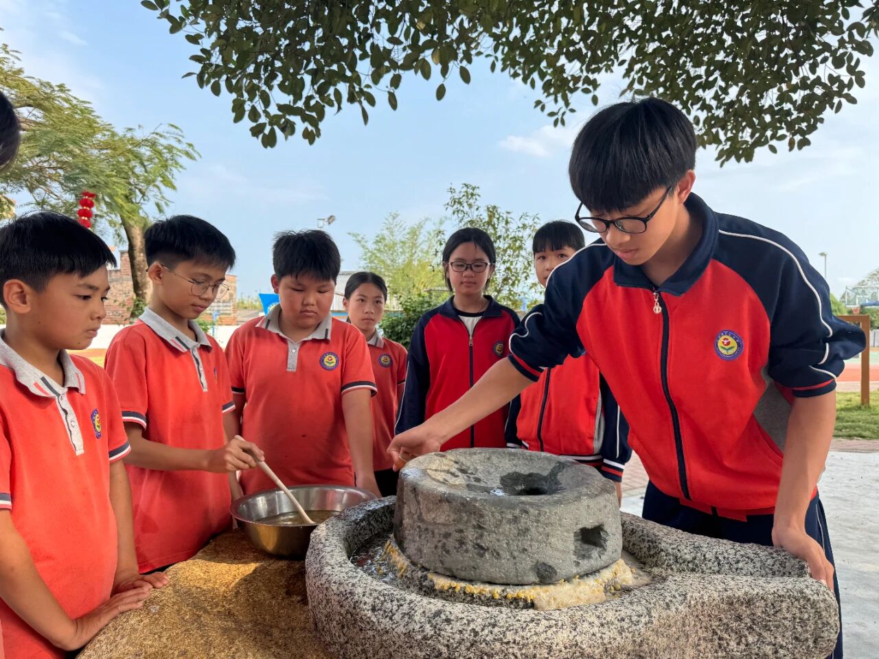 石磨緩緩轉(zhuǎn)動,醇厚的豆?jié){流淌而出,恩平市大田鎮(zhèn)中心小學(xué)的孩子們在立志園里,通過親手研磨豆?jié){,聆聽老師講述革命年代里一袋糍粑、一塊豆腐如何成為軍民魚水情的見證……