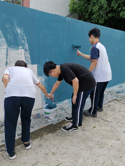整面墻繪長約30米,高約2米。由14名美術(shù)特長生在美術(shù)老師的指導(dǎo)下,主動利用課余時間,精心調(diào)顏料、刷墻、勾輪廓、涂色彩......經(jīng)過三個星期的努力,把一面曾經(jīng)“灰頭土臉”的水泥墻,變成四幅以“抗疫”為主題的形象生動的畫面,激勵同學(xué)們學(xué)會主動承擔(dān)社會責(zé)任,愛學(xué)校、愛家鄉(xiāng)、愛祖國!