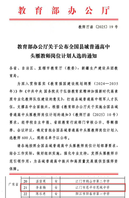 喜報(bào)!我市李素梅老師入選首批全國(guó)縣域普通高中頭雁教師崗位計(jì)劃