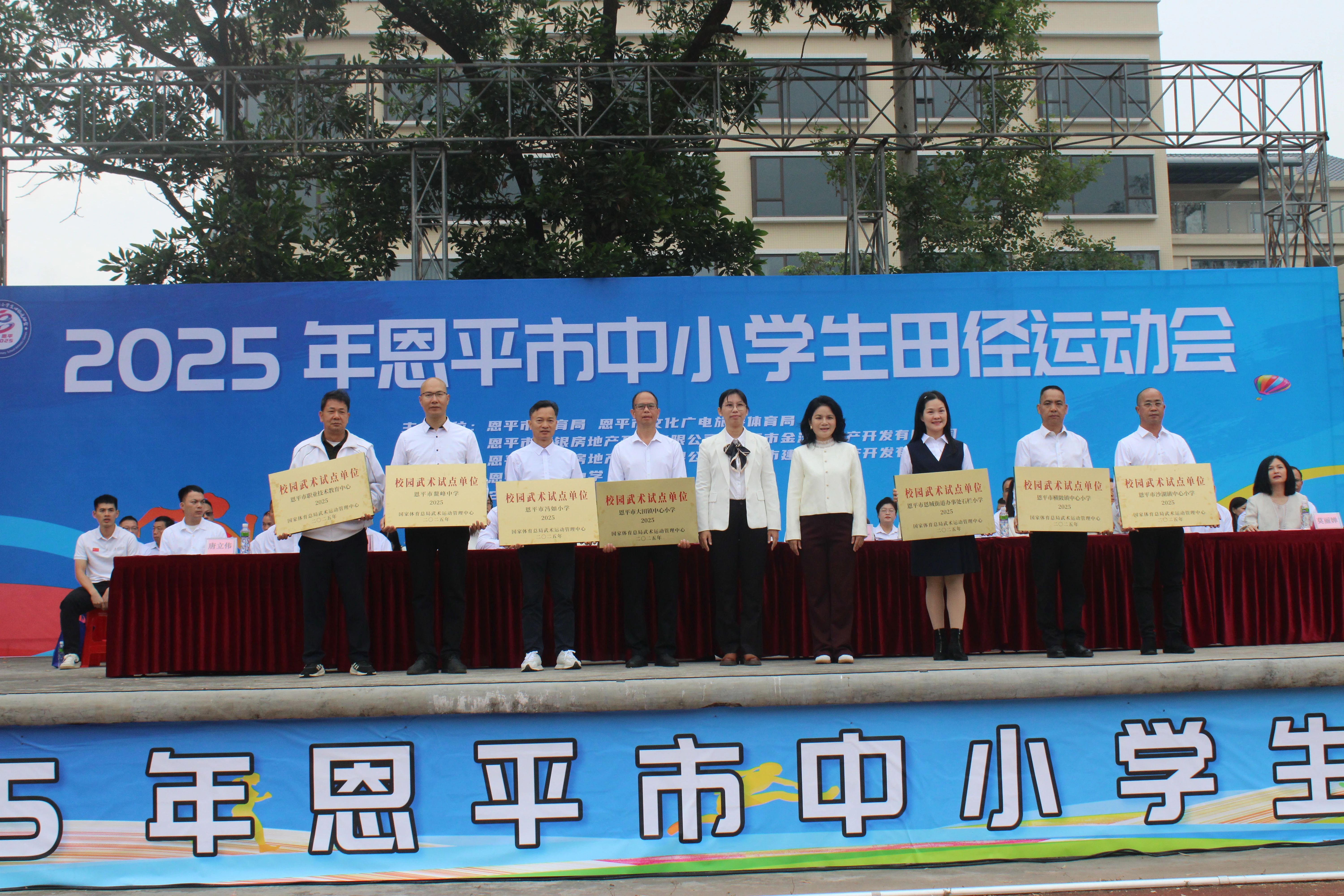 開(kāi)幕式現(xiàn)場(chǎng)還舉行了授牌儀式,恩平市職教中心、鰲峰中學(xué)、馮如小學(xué)、大田鎮(zhèn)中心小學(xué)、恩城街道石欄小學(xué)、橫陂鎮(zhèn)中心小學(xué)、沙湖鎮(zhèn)中心小學(xué)等七所學(xué)校被國(guó)家體育總局武術(shù)運(yùn)動(dòng)管理中心授予“校園武術(shù)試點(diǎn)?!狈Q號(hào)。此外,恩平市教育局向大力支持運(yùn)動(dòng)會(huì)的恩平市盛悅地產(chǎn)公司、恩平市金沃房地產(chǎn)開(kāi)發(fā)有限公司、恩平匯銀房地產(chǎn)開(kāi)發(fā)有限公司、恩平市建安房地產(chǎn)開(kāi)發(fā)有限公司贈(zèng)送牌匾。