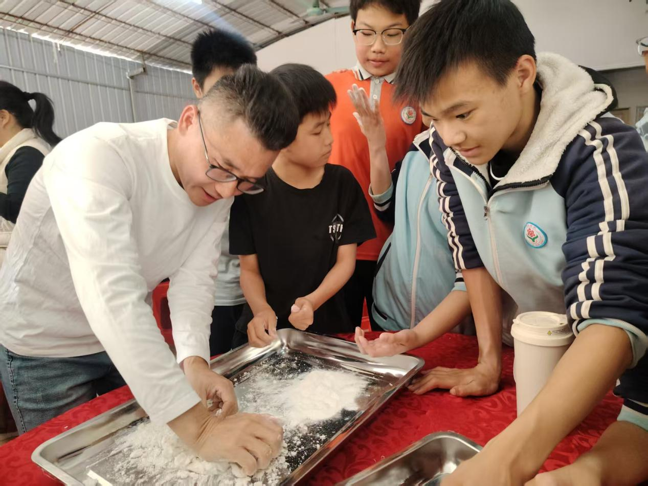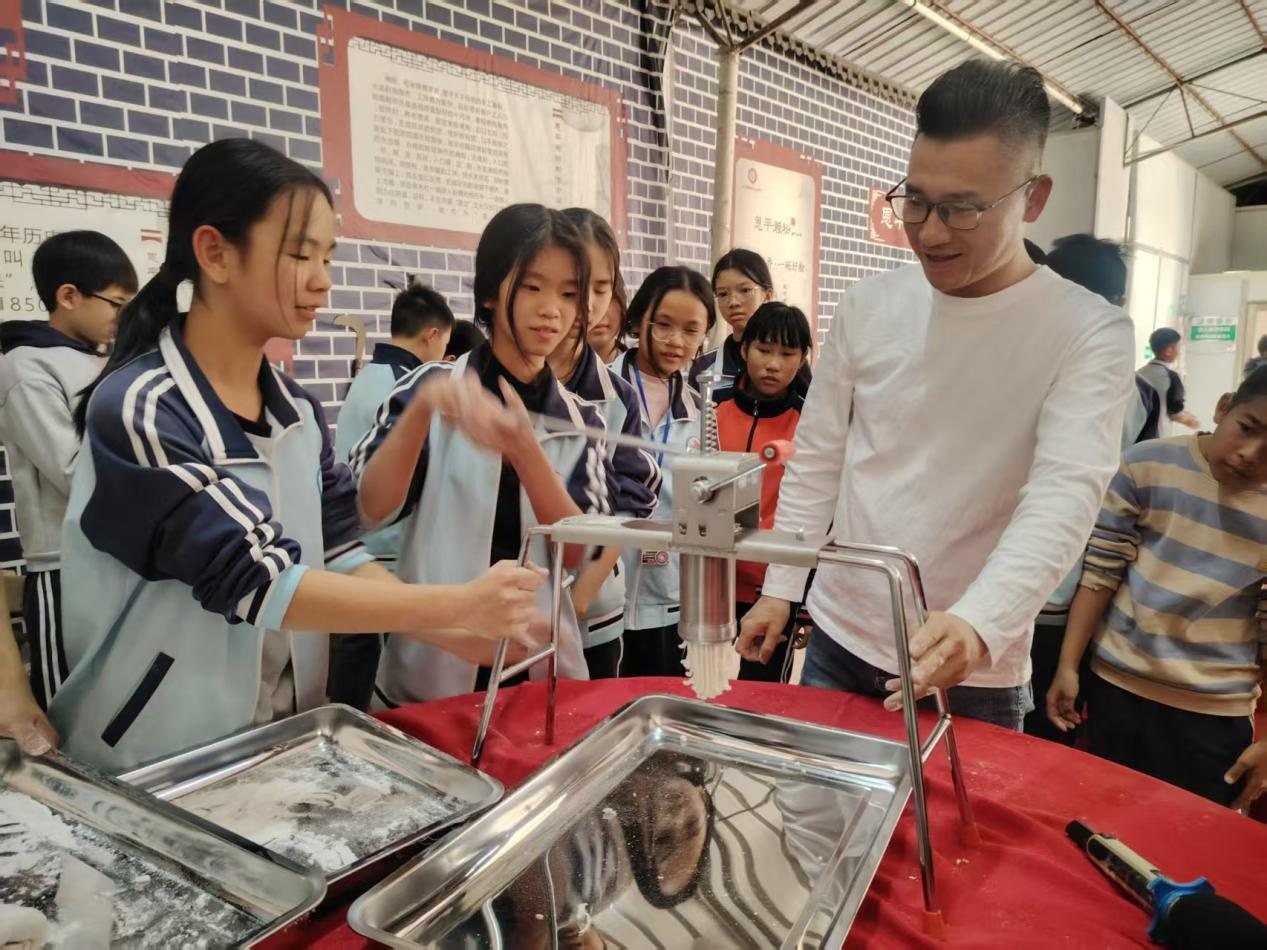 課程注重引導(dǎo)學(xué)生走出校園,走進稻田,辨識水稻,采訪農(nóng)民,了解牛江鎮(zhèn)種植稻米的自然條件與歷史,探秘“米之源”;奔赴作坊,拜訪瀨粉制作非遺傳承人吳有坤,學(xué)習并親手體驗瀨粉制作工序,傳承“粉之藝”;走進鄉(xiāng)村聽老人講述瀨粉與華僑、與中秋節(jié)、與家風的故事,理解食物背后的文化與情感,探尋“情之蘊”;學(xué)習烹制不同湯底瀨粉,品嘗并總結(jié)牛江瀨粉的口感特點,探究其背后飲食文化的奧秘,品味“味之道”。讓孩子們踏上一段充滿米香、粉韻和鄉(xiāng)情的旅程,讓優(yōu)秀的傳統(tǒng)文化在他們的親身實踐和深度思考中生根發(fā)芽。