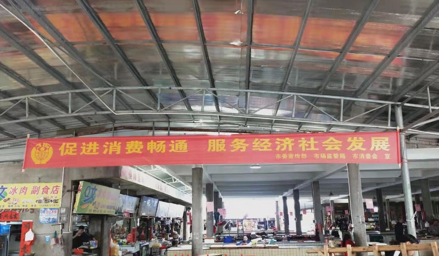 在農(nóng)貿(mào)市場橫掛宣傳橫幅