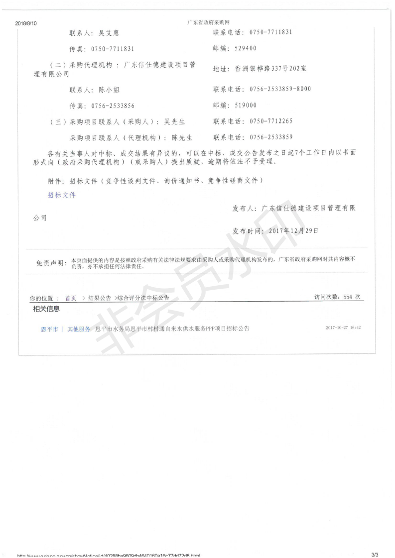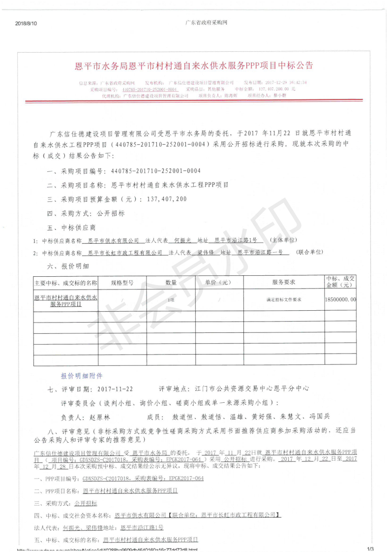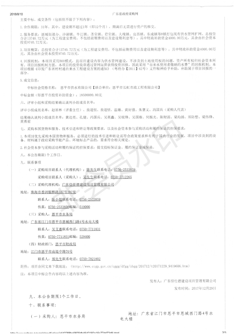 關(guān)于恩平市村村通自來水供水服務(wù)PPP項(xiàng)目中標(biāo)的公告