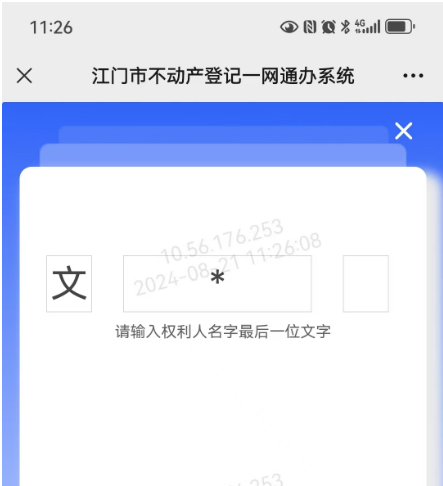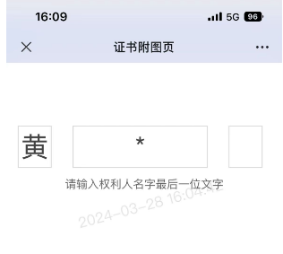 (2)在彈窗中輸入證書上記載權利人最后一位文字