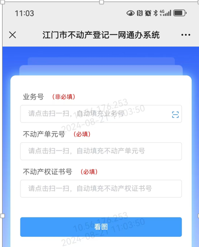 (2)在圖1中“業(yè)務號”非必填,不動產(chǎn)單元號、不動產(chǎn)權證號為必填項。請用戶嚴格按照《不動產(chǎn)權證書》上信息填寫,點擊“看圖”。輸入中要注意括號需要用中文狀態(tài)下的,如:粵(2024)XX市不動產(chǎn)權第*******號。