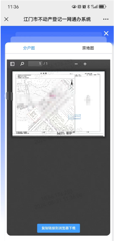 (1)在查看分戶圖、宗地圖界面上,需要下載圖形文件時,點擊界面底部的“復制鏈接到瀏覽器下載”,如圖5。