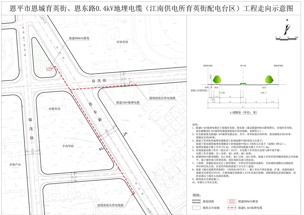 目位于恩城育英街、恩東路(通過(guò)擬建800kVA箱變降壓,分別經(jīng)育英街、恩東路敷設(shè)0.4kV地埋電纜接現(xiàn)狀低壓供電線路。沿線擬建電纜工作井(低壓井)共4個(gè),且電纜工作井的長(zhǎng)邊須與路中線平衡。電纜工作井規(guī)格:長(zhǎng)1.50米、寬1.40米、深1.00米;擬建800kVA箱變規(guī)格:長(zhǎng)3.90米、寬3.10米、高2.80米,擬建于市體育館西側(cè)的現(xiàn)狀公共綠地中,屬于城管部門管理范圍,須征詢相關(guān)部門的意見(jiàn)。(如圖所示)