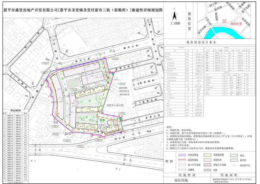 該地塊位于恩平市圣堂鎮(zhèn)圣堂圩新市三街(原糧所),規(guī)劃用地性質(zhì)為商住用地,總規(guī)劃用地面積為11915.3平方米(17.8729畝);總建筑面積為23057.07平方米(其中計容積率建筑面積21096.9平方米,不計容積率建筑面積1960.17平方米),建筑密度為34.97%,容積率為1.77;綠地率為31.8%;建筑層數(shù):1-11層。(詳見附圖)