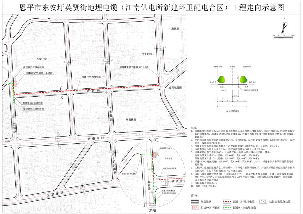該項(xiàng)目位于東安圩英賢街(由怡景花園東南側(cè)已報(bào)建電纜分接箱轉(zhuǎn)接出線,經(jīng)英賢街敷設(shè)10kV地埋電纜,通過(guò)擬建800kVA箱變降壓后,經(jīng)教育路敷設(shè)0.4kV地埋電纜接現(xiàn)狀低壓供電線路)。擬建地埋電纜總長(zhǎng)約500米,其中:擬建10kV地埋電纜約430米,擬建0.4kV地埋電纜約70米;沿線擬建電纜工作井共6個(gè),其中:高壓電纜工作井5個(gè),規(guī)格:長(zhǎng)3.00米、寬1.40米、深1.00米;低壓電纜工作井1個(gè),規(guī)格:長(zhǎng)1.50米、寬1.40米、深1.00米;且電纜工作井的長(zhǎng)邊須與路中線平衡。擬建800kVA箱變規(guī)格:長(zhǎng)3.90米、寬3.10米、高2.80米,共1個(gè),擬建于東安中學(xué)西側(cè)的空地中(如圖所示)。