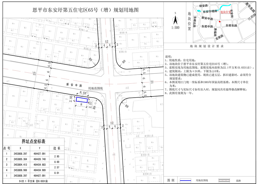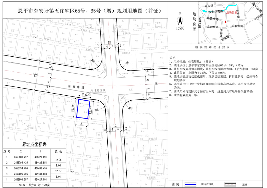 恩平市東安圩第五住宅區(qū)65號(hào)地塊(國(guó)土證號(hào):恩府國(guó)用(2015)第00926號(hào)),用地面積80平方米,用地性質(zhì)為住宅用地;恩平市東安圩第五住宅區(qū)65號(hào)(增)地塊(國(guó)土證號(hào):恩府國(guó)用(2015)第00924號(hào)),用地性質(zhì)為住宅用地;現(xiàn)開(kāi)發(fā)單位要求把65號(hào)、65號(hào)(增)合并為一塊用地,合并后總用地面積為102.1平方米,合0.1531畝,合并后用地性質(zhì)仍為住宅用地。經(jīng)審核,65號(hào)、65號(hào)(增)合并為一塊用地,用地性質(zhì)不變,符合《恩平市中心城區(qū)總體規(guī)劃(2010-2030)》的規(guī)劃要求,現(xiàn)給予公示。