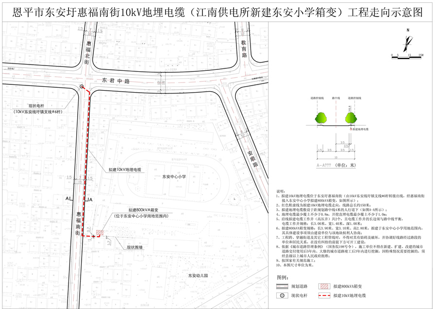 該項(xiàng)目位于東安圩惠福南街(由10kV東安線圩鎮(zhèn)支線#6桿轉(zhuǎn)接出線,經(jīng)惠福南街接入東安中心小學(xué)擬建800kVA箱變)。擬建地埋電纜總長約150米,沿線擬建電纜工作井(高壓井)共2個,規(guī)格:長3.00米、寬1.40米、深1.00米,且電纜工作井的長邊須與路中線平衡。擬建800kVA箱變規(guī)格:長3.90米、寬3.10米、高2.80米,共1個,擬建于東安中心小學(xué)用地范圍內(nèi),其具體建設(shè)事項(xiàng)須由建設(shè)單位與該地塊權(quán)利人協(xié)商(如圖所示)。