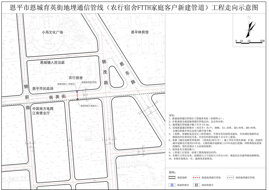 為了進(jìn)一步推進(jìn)規(guī)劃公示制度,充分聽取社會各界對恩平市恩城育英街地埋通信管線(農(nóng)行宿舍FTTH家庭客戶新建管道)工程走向的意見和建議,依照《中華人民共和國城鄉(xiāng)規(guī)劃法》規(guī)定,現(xiàn)對相關(guān)事項公示如下: