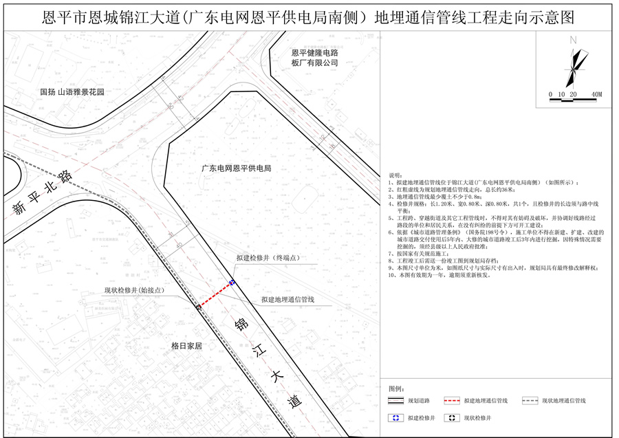 為了進(jìn)一步推進(jìn)規(guī)劃公示制度,充分聽取社會(huì)各界對(duì)恩平市恩城錦江大道(廣東電網(wǎng)恩平供電局南側(cè))地埋通信管線工程走向的意見和建議,依照《中華人民共和國(guó)城鄉(xiāng)規(guī)劃法》規(guī)定,現(xiàn)對(duì)相關(guān)事項(xiàng)公示如下: