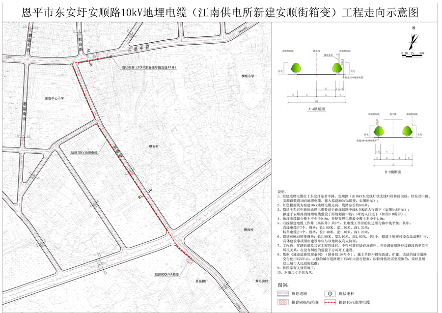 該項(xiàng)目位于東安圩東君中路、安順路,由10kV東安線圩鎮(zhèn)支線#1桿轉(zhuǎn)接出線,經(jīng)東君中路、安順路敷設(shè)10kV地埋電纜,接入擬建800kVA箱變。擬建地埋電纜總長約685米,沿線擬建電纜工作井(高壓井)共8個,其中:直線電纜井7個,規(guī)格:長3.00米、寬1.40米、深1.20米;轉(zhuǎn)角電纜井1個,規(guī)格:長2.40米、寬1.40米、深1.20米;且電纜工作井的長邊須與路中線平衡。擬建800kVA箱變規(guī)格:長3.90米、寬3.10米、高2.80米,共1個,擬建于順槎村委會晶晶糖廠內(nèi),其具體建設(shè)事項(xiàng)須由建設(shè)單位征詢地塊權(quán)利人意見,經(jīng)同意后方可開工建設(shè)(如圖所示)。