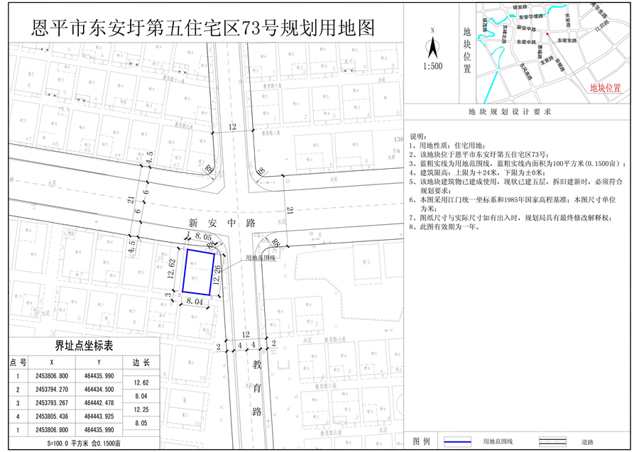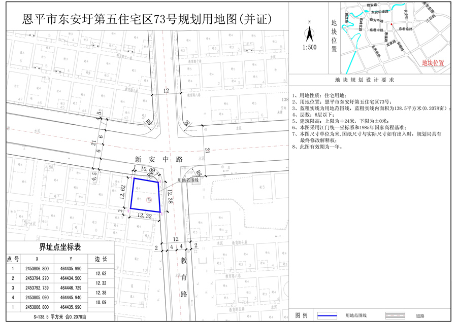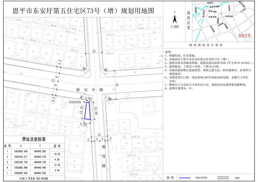 恩平市東安圩第五住宅區(qū)73號(hào)地塊(國土證號(hào):恩府國用第023035號(hào)),用地面積100.0平方米,用地性質(zhì)為住宅用地;恩平市東安圩第五住宅區(qū)73號(hào)(增)地塊(國土證號(hào):恩府國用(2016)第00418號(hào)),用地性質(zhì)為住宅用地;由于開發(fā)單位在73號(hào)、73號(hào)(增)兩塊用地范圍線內(nèi)已建成一棟五層建筑物使用,現(xiàn)要求把73號(hào)、73號(hào)(增)合并為一塊用地,合并后總用地面積為138.5平方米,合0.2078畝,合并后用地性質(zhì)仍為住宅用地。經(jīng)審核,73號(hào)、73號(hào)(增)合并為一塊用地,用地性質(zhì)不變,符合《恩平市中心城區(qū)總體規(guī)劃(2010-2030)》的規(guī)劃要求,現(xiàn)給予公示。