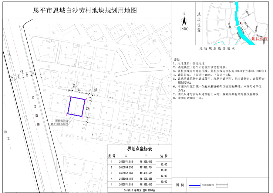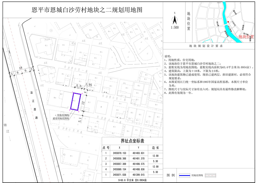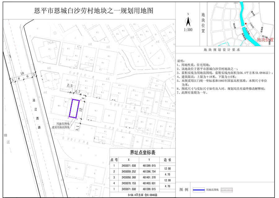 該項目位于恩平市恩城白沙勞村地塊,國土證號為:[恩府國用(2016)第00579號],用地面積為120.0平方米,用地性質(zhì)為住宅用地;由于開發(fā)單位在白沙勞村地塊用地范圍線內(nèi)已建成一棟建筑占地面積為63.6平方米的兩層建筑物并使用,現(xiàn)開發(fā)單位要求把白沙勞村地塊分為兩塊用地,其中白沙勞村地塊之一用地面積為56.4平方米,白沙勞村地塊之二用地面積為63.6平方米,分證后用地性質(zhì)均不變,仍為住宅用地。經(jīng)審核,符合《恩平市中心城區(qū)總體規(guī)劃(2010-2030)》的規(guī)劃要求,現(xiàn)給予公示。