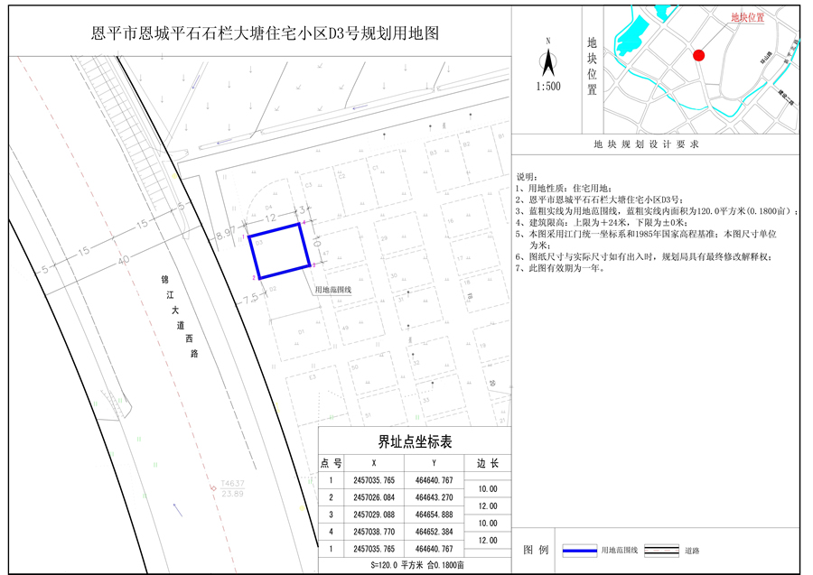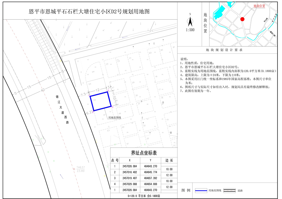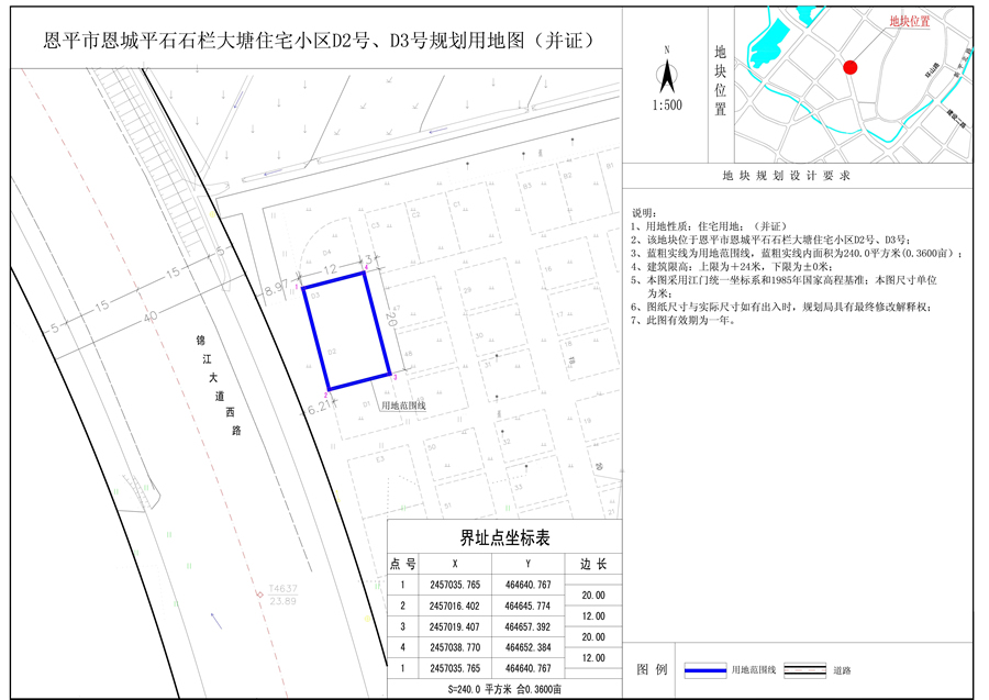 該項(xiàng)目位于恩平市恩城平石石欄大塘住宅小區(qū)D2號(hào)地塊(國(guó)土證號(hào):恩府國(guó)用(2015)字第01295號(hào)),用地面積120.0平方米,用地性質(zhì)為住宅用地;恩平市恩城平石石欄大塘住宅小區(qū)D3號(hào)地塊(國(guó)土證號(hào):恩府國(guó)用(2015)字第01298號(hào)),用地性質(zhì)為住宅用地;現(xiàn)開(kāi)發(fā)單位要求把D2號(hào)地塊、D3號(hào)地塊合并為一塊用地,合并后總用地面積為240.0平方米,合0.3600畝,合并后用地性質(zhì)仍為住宅用地。經(jīng)審核,符合《恩平市中心城區(qū)總體規(guī)劃(2010-2030)》的規(guī)劃要求,現(xiàn)給予公示。