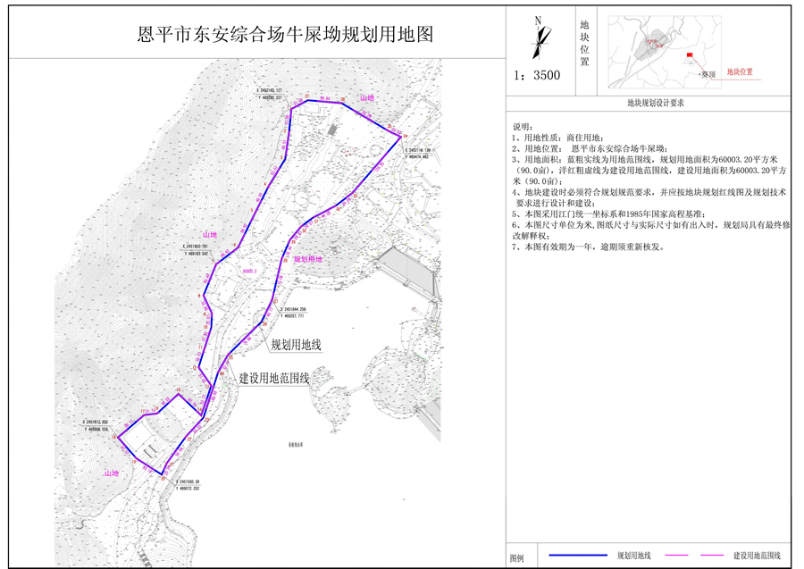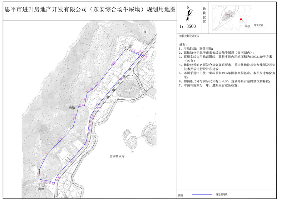 擬調(diào)整用地原位于恩平市東安綜合場牛屎坳地塊,于2006年已辦理國土證[國土證號:恩府國用(2006)第00762號],規(guī)劃用地面積為60003.20平方米(90.0畝)。用地性質(zhì)為商住用地?,F(xiàn)開發(fā)單位因?qū)嶋H發(fā)展需求和根據(jù)恩府辦函[2016]444號文件要求以及市國土資源局測繪隊提供的新宗地圖,申請調(diào)整用地范圍線,調(diào)整后位于恩平市東安綜合場牛屎坳地塊,用地性質(zhì)及規(guī)劃用地面積不變,用地性質(zhì)仍為商住用地,規(guī)劃用地面積仍為60003.20平方米(90.0畝)(詳見附圖),現(xiàn)給予公示。
