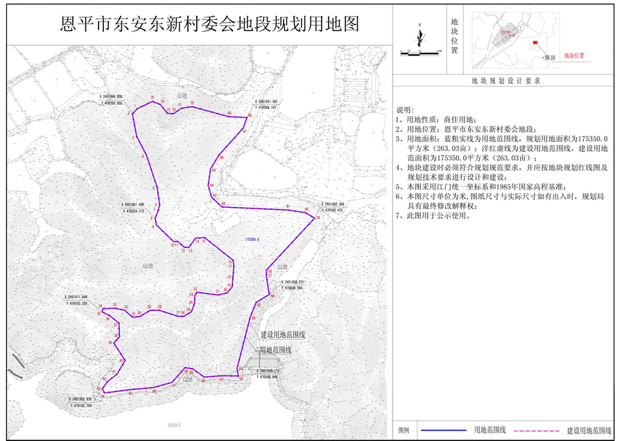 擬調(diào)整用地原位于恩平市東安新村委會(huì)地段,于2006年已辦理國(guó)土證[國(guó)土證號(hào):恩府國(guó)用(2006)第00631號(hào)],規(guī)劃用地面積為175350.0平方米(263.03畝),用地性質(zhì)為商住用地?,F(xiàn)開(kāi)發(fā)單位因?qū)嶋H發(fā)展需求和根據(jù)恩府辦函[2016]444號(hào)文件要求以及市國(guó)土資源局測(cè)繪隊(duì)提供的新宗地圖,申請(qǐng)調(diào)整用地范圍線,調(diào)整后位于到恩平市東安新村委會(huì)地段,用地性質(zhì)及規(guī)劃用地面積不變,用地性質(zhì)仍為商住用地,規(guī)劃用地面積仍為175350.0平方米,建設(shè)用地面積為175350.0平方米(詳見(jiàn)附圖),現(xiàn)給予公示。