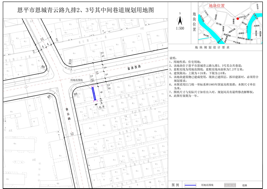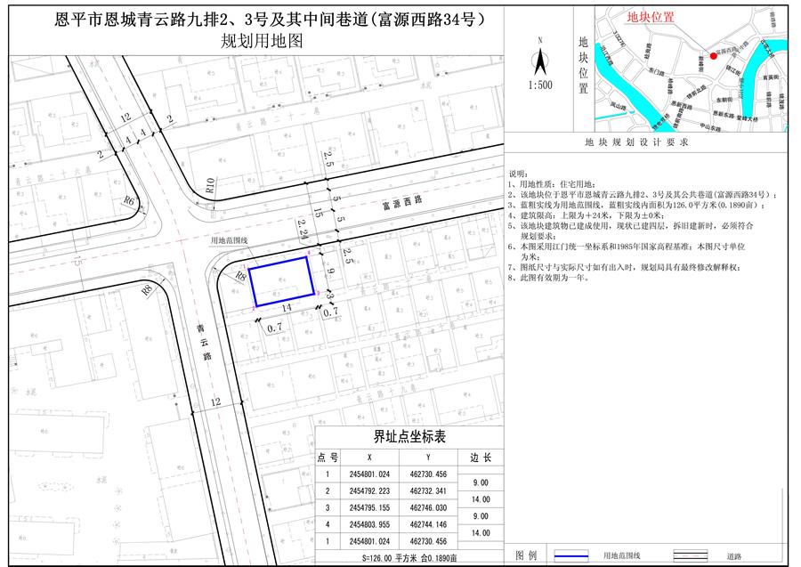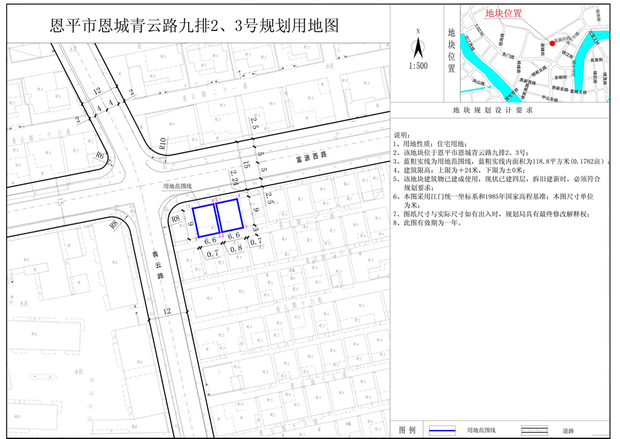 2、用地規(guī)模:126.0平方米(0.1890畝)。其中恩平市恩城青云路九排2、3號地塊面積為118.8平方米,2、3號中間巷道面積為7.2平方米。
