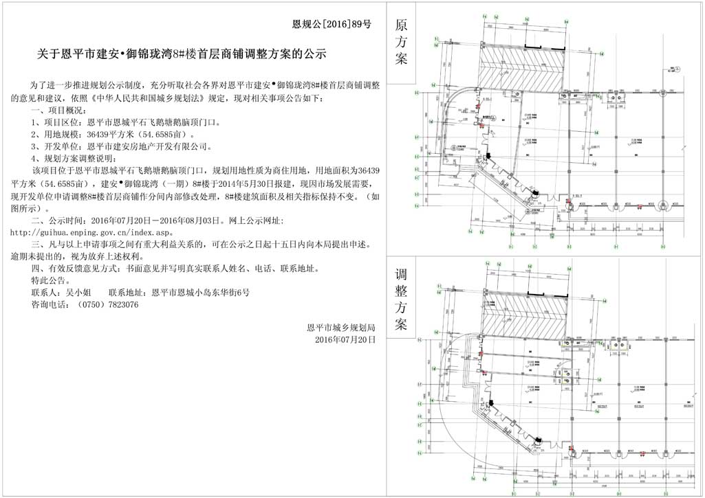 恩規(guī)公[2016]89號關(guān)于恩平市建安御錦瓏灣8棟首層商鋪調(diào)整方案的公示