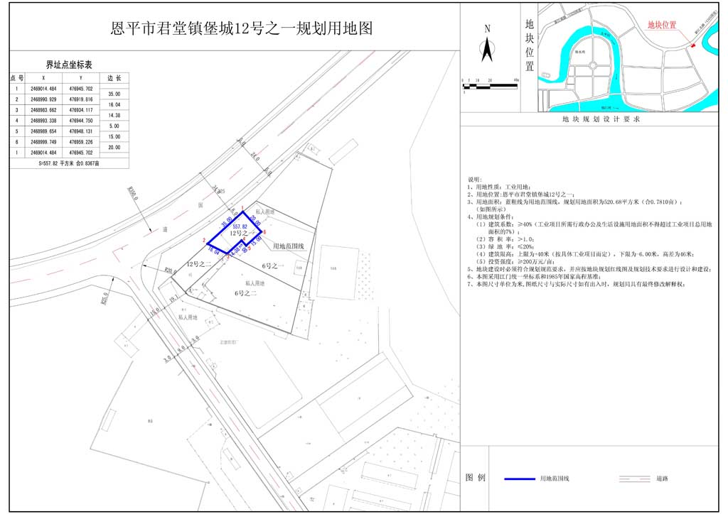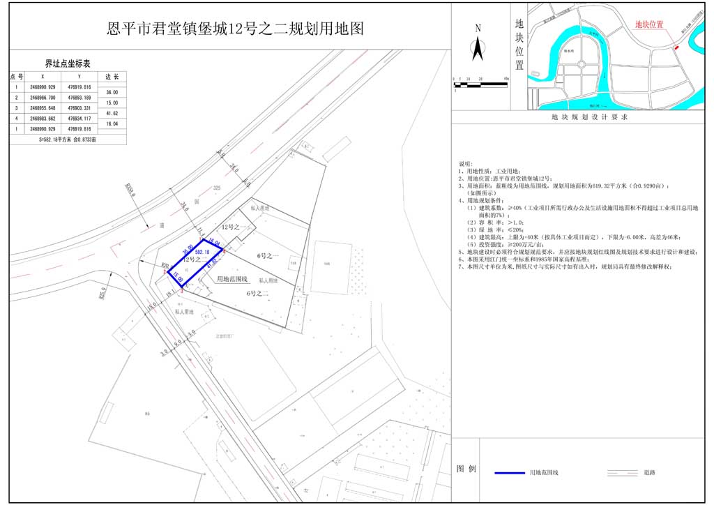 該地塊位于恩平市君堂鎮(zhèn)堡城12號(hào),用地性質(zhì)為工業(yè)用地,原國(guó)土證用地面積為1140.00平方米(1.7100)。現(xiàn)開發(fā)單位申請(qǐng)將該地塊分為兩塊用地,其中堡城12號(hào)之一地塊用地面積為557.82平方米(0.8367畝);堡城12號(hào)之二地塊用地面積為582.18平方米(0.8733畝)(詳見附圖)。分證后用地性質(zhì)均不變,仍為工業(yè)用地?,F(xiàn)給予公示。