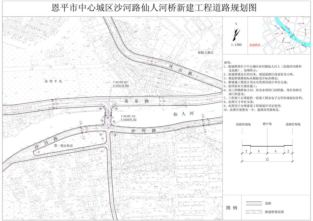 該項目位于恩平市中心城區(qū)沙河路仙人河橋南側(cè)橋頭,原規(guī)劃方案中橋梁總長約52米,紅線寬度為12米,橋梁南側(cè)連接沙河路,沙河路寬度為11.5米(斷面為2.25米人行道+7.5米車行道+1.75米人行道)。原規(guī)劃橋梁路面標高根據(jù)設計標高確定。