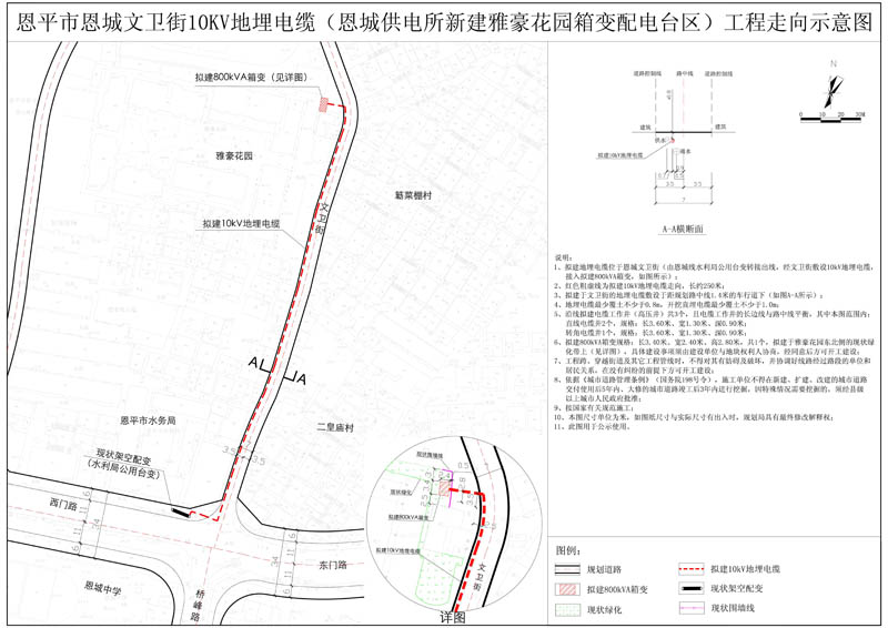 該項目位于恩城文衛(wèi)街。由恩城線水利局公用臺變轉(zhuǎn)接出線,經(jīng)文衛(wèi)街敷設(shè)10kV地埋電纜,接入擬建800kVA箱變(如圖所示)。擬建地埋電纜總長約250米,沿線擬建高壓電纜工作井共3個。其中:直線電纜井2個,規(guī)格:長3.60米、寬1.30米、深0.90米;轉(zhuǎn)角電纜井1個,規(guī)格:長3.60米、寬1.30米、深0.90米,且電纜工作井的長邊線與路中線平衡。擬建800KVA箱變規(guī)格:長3.40米、寬2.40米、高2.80米,共一個,擬建于雅豪花園東北側(cè)的現(xiàn)狀綠化帶上,具體建設(shè)事項須由建設(shè)單位與地塊權(quán)利人協(xié)商,經(jīng)同意后方可開工建設(shè)。