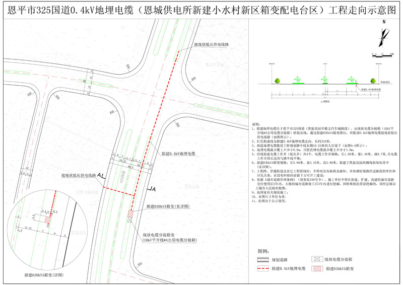 該項(xiàng)目位于恩平市325國(guó)道(凱旋花園至精文汽車城路段),由現(xiàn)狀電纜分接箱(10kV平開線#4公用電纜分接箱)轉(zhuǎn)接出線,通過擬建630kVA箱變降壓,再敷設(shè)0.4kV地埋電纜接現(xiàn)狀低壓供電線路(如圖所示)。擬建地埋電纜總長(zhǎng)約310米;沿線擬建電纜工作井(低壓井)共4個(gè),電纜工作井規(guī)格:長(zhǎng)1.50米、寬1.40米、深0.7米, 且電纜工作井的長(zhǎng)邊須與路中線平衡;擬建630kVA箱變規(guī)格:長(zhǎng)3.90米、寬3.10米、高2.80米,擬建于凱旋花園西側(cè)現(xiàn)狀綠化帶中。