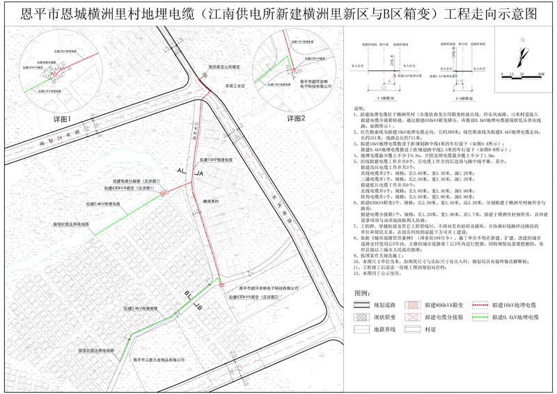 該項(xiàng)目位于橫洲里村,由現(xiàn)狀曲龍公用箱變轉(zhuǎn)接出線,經(jīng)東風(fēng)南路、12米村道接入擬建電纜分接箱轉(zhuǎn)接,通過擬建630kVA箱變降壓,再敷設(shè)0.4kV地埋電纜接現(xiàn)狀低壓供電線路(如圖所示)。擬建地埋電纜總長約711米。沿線擬建電纜工作井共9個(gè),且電纜工作井的長邊須與路中線平衡。其中:擬建高壓電纜工作井共3個(gè):直線電纜井2個(gè),規(guī)格:長3.60米、寬1.30米、深1.20米;三通電纜井1個(gè),規(guī)格:長2.50米,寬1.30米,深1.20米;擬建低壓電纜工作井共6個(gè):直線電纜井5個(gè),規(guī)格:長3.60米、寬1.30米、深0.90米;轉(zhuǎn)角電纜井1個(gè),規(guī)格:長3.60米,寬2.00米,深0.90米;擬建630kVA箱變2個(gè),規(guī)格:長2.50米、寬3.40米、高2.20米,分別擬建于橫洲里村廁所旁與路旁;擬建電纜分接箱1個(gè),規(guī)格:長1.20米、寬1.90米、高1.7米,擬建于橫洲里村廁所旁,具體建設(shè)事項(xiàng)須與該項(xiàng)地塊權(quán)利人協(xié)商。