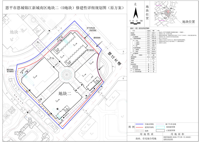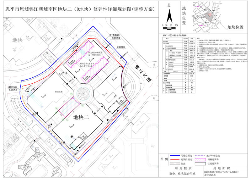 該項(xiàng)目位于恩平市恩城錦江新城南區(qū)地塊二(D地塊),規(guī)劃用地性質(zhì)為商業(yè)、住宅混合用地,地塊用地面積為48269.7平方米(72.4046畝),因業(yè)務(wù)發(fā)展需要,開發(fā)單位申請調(diào)整地塊二(D地塊)的規(guī)劃方案。具體調(diào)整如下: