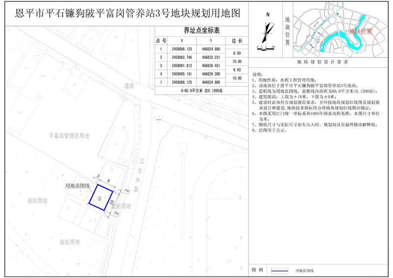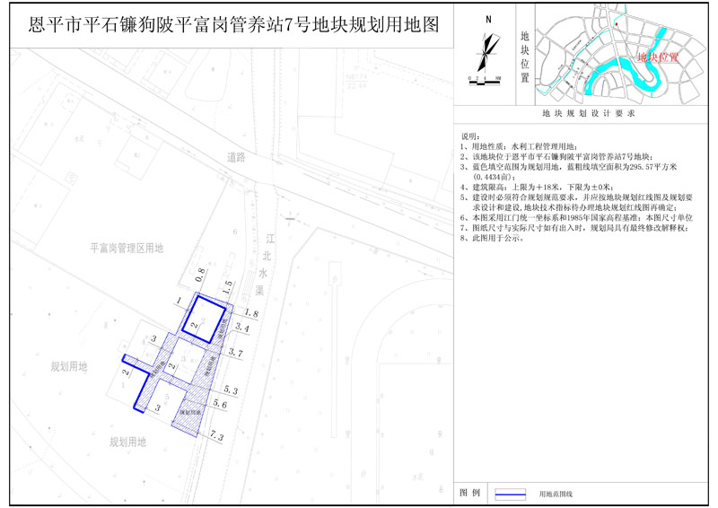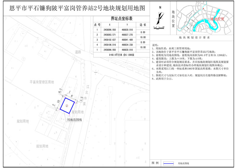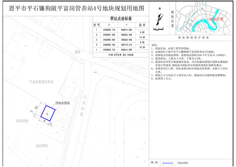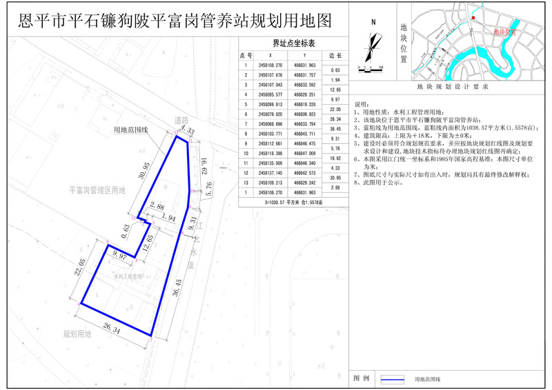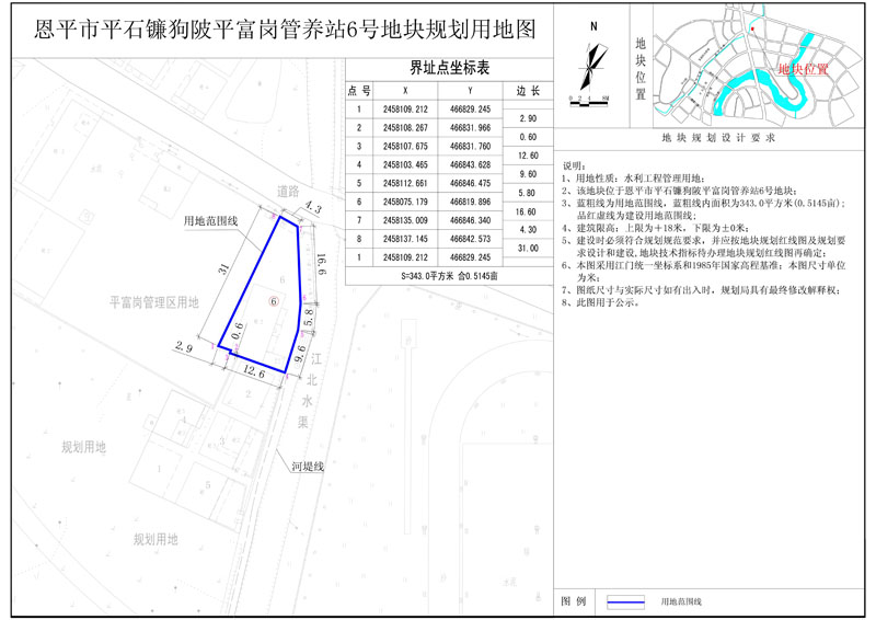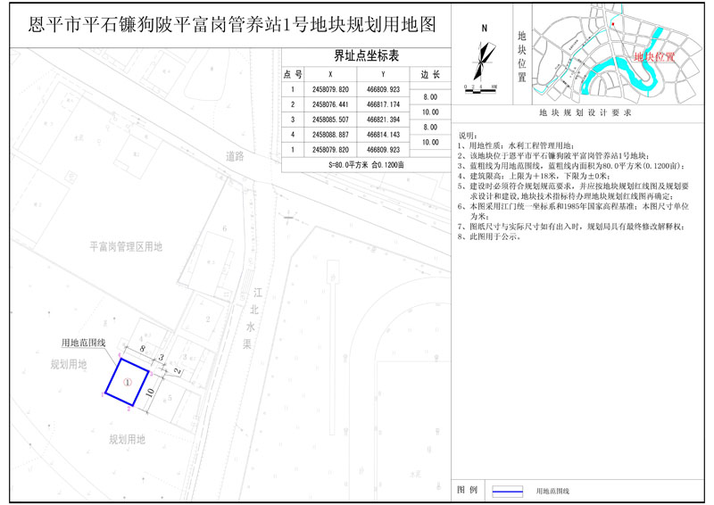 該地塊位于恩平市平石鐮狗陂平富崗管養(yǎng)站,國(guó)土證號(hào)為(恩府國(guó)用總字第038001號(hào)),國(guó)土證用地性質(zhì)為水利工程管理用地,規(guī)劃用地面積為1038.57平方米?,F(xiàn)開發(fā)單位申請(qǐng)將該地塊分為七塊用地,其中1號(hào)地塊用地面積為80.0平方米,2號(hào)地塊用地面積為80.0平方米,3號(hào)地塊用地面積為80.0平方米,4號(hào)地塊用地面積為80.0平方米,5號(hào)地塊用地面積為80.0平方米,6號(hào)地塊用地面積為343.0平方米;分證后用地性質(zhì)仍為水利工程管理用地,符合《恩平市中心城區(qū)總體規(guī)劃(2010-2030)》的規(guī)劃要求,現(xiàn)給予公示。(詳見附圖)