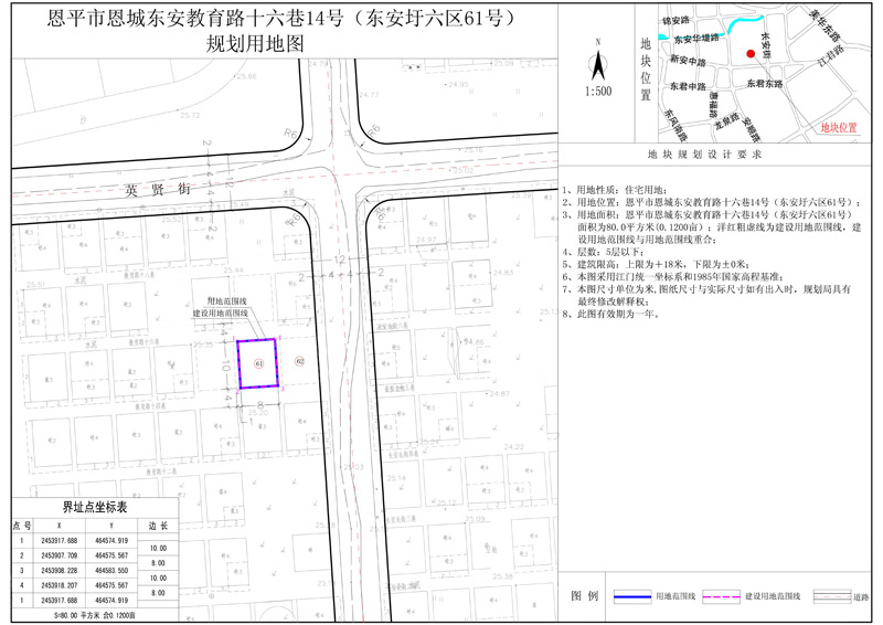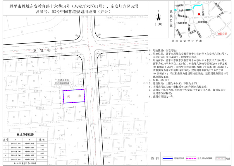 恩平市恩城東安教育路十六巷14號(東安圩六區(qū)61號)[粵(2016)恩平市不動產(chǎn)權(quán)第0002071號],用地面積80.0平方米(0.1200畝),用地性質(zhì)為住宅用地;東安圩六區(qū)62號地塊[恩國用(東安)第023997號],用地面積80.0平方米(0.1200畝),用地性質(zhì)為住宅用地,61、62號中間巷道面積為10.0平方米(0.0150畝);現(xiàn)開發(fā)單位要求把恩平市恩城東安教育路十六巷14號(東安圩六區(qū)61號)、東安圩六區(qū)62號及61、62號中間巷道合并為一塊用地,合并后總用地面積為170.0平方米,合0.2550畝,合并后用地性質(zhì)仍為住宅用地。經(jīng)審核,恩平市恩城東安教育路十六巷14號(東安圩六區(qū)61號)、東安圩六區(qū)62號及61、62號中間巷道合并為一塊用地,用地性質(zhì)不變,符合《恩平市中心城區(qū)總體規(guī)劃(2010-2030)》的規(guī)劃要求,現(xiàn)給予公示。