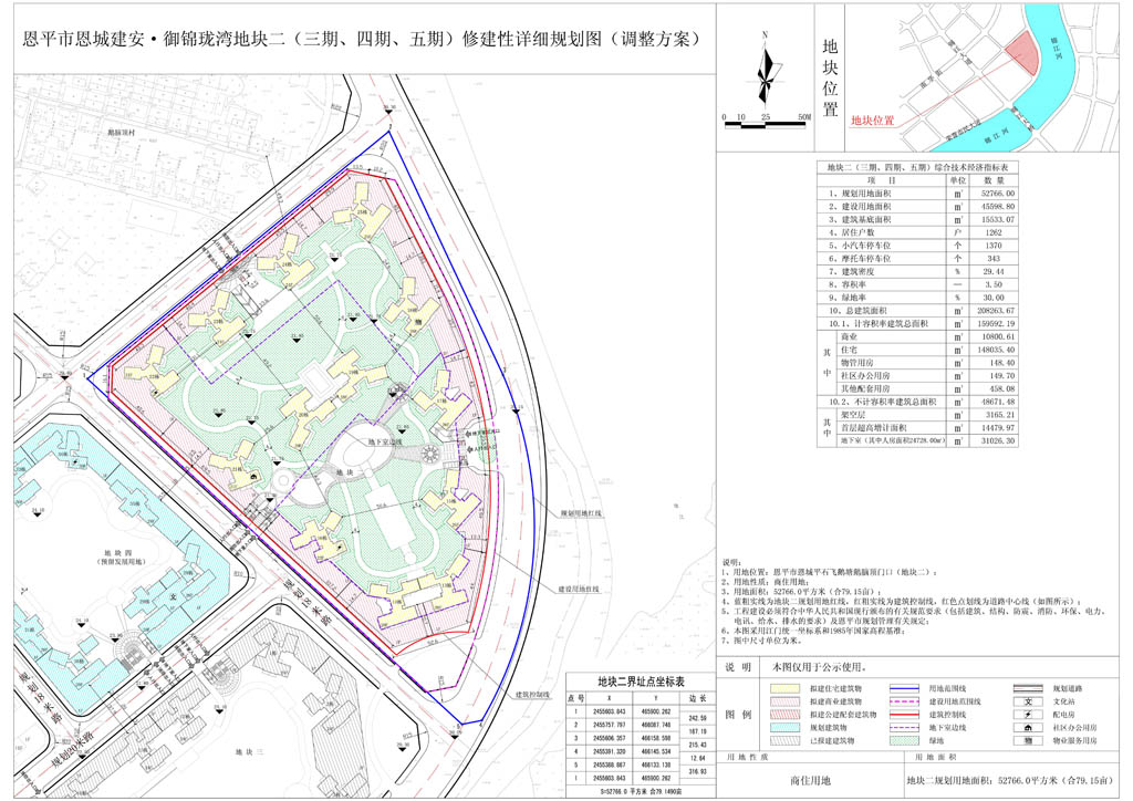 該項(xiàng)目位于恩平市恩城平石飛鵝塘鵝腦頂門(mén)口(地塊二),規(guī)劃用地性質(zhì)為商住用地,規(guī)劃用地面積為52766.00平方米(合79.15畝),建設(shè)用地面積為45598.80平方米。原規(guī)劃方案建筑布局主要為1層的商業(yè)裙樓及15棟22-30層的住宅樓,主要經(jīng)濟(jì)技術(shù)指標(biāo):總建筑面積為207291.58平方米(其中:計(jì)容積率建筑面積為159595.80平方米,不計(jì)容積率建筑面積47695.78平方米),建筑基底面積為14501.89平方米,建筑密度為27.48%,容積率為3.50,綠地率為33%,居住戶(hù)數(shù)為1807戶(hù),停車(chē)位1921個(gè)(詳見(jiàn)附圖)。