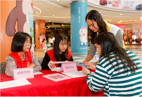 招聘會現(xiàn)場黨員志愿者和社工為求職者解答疑問