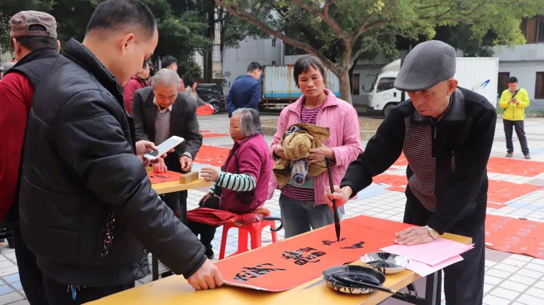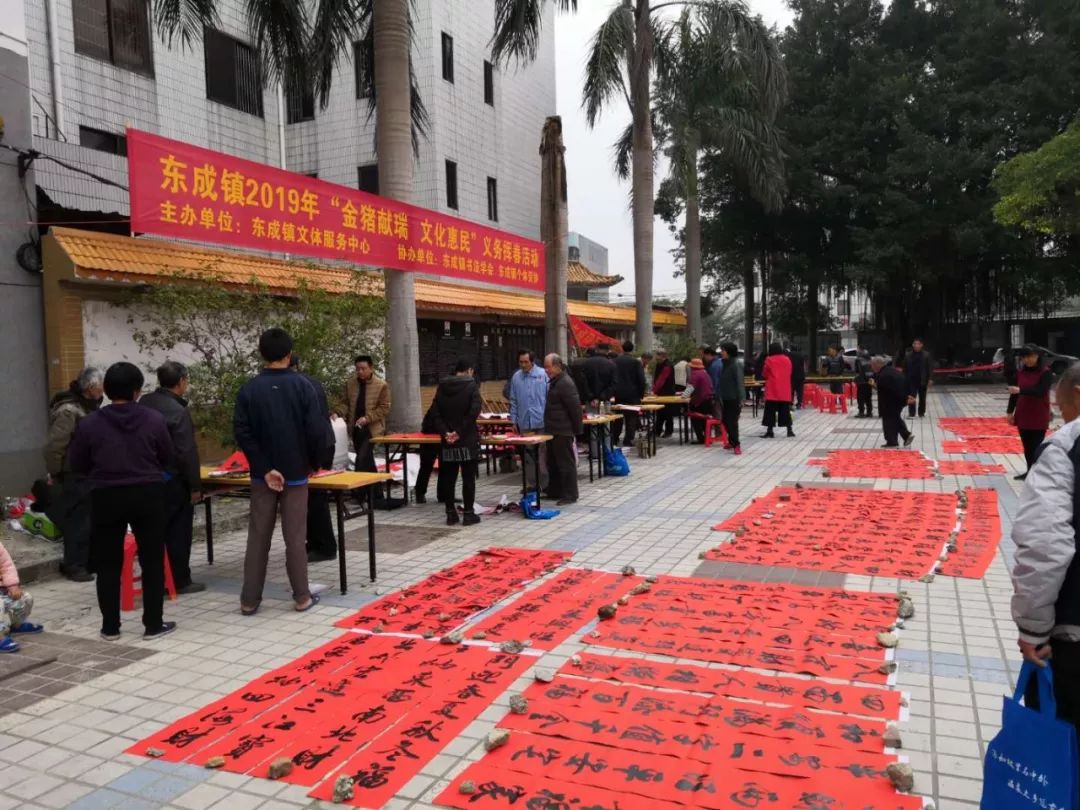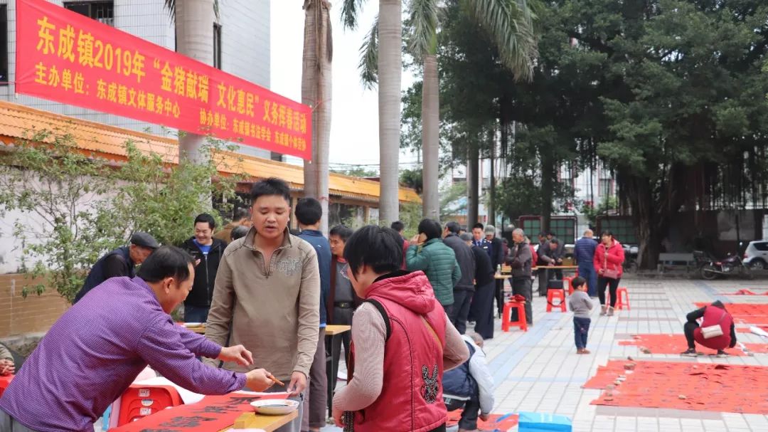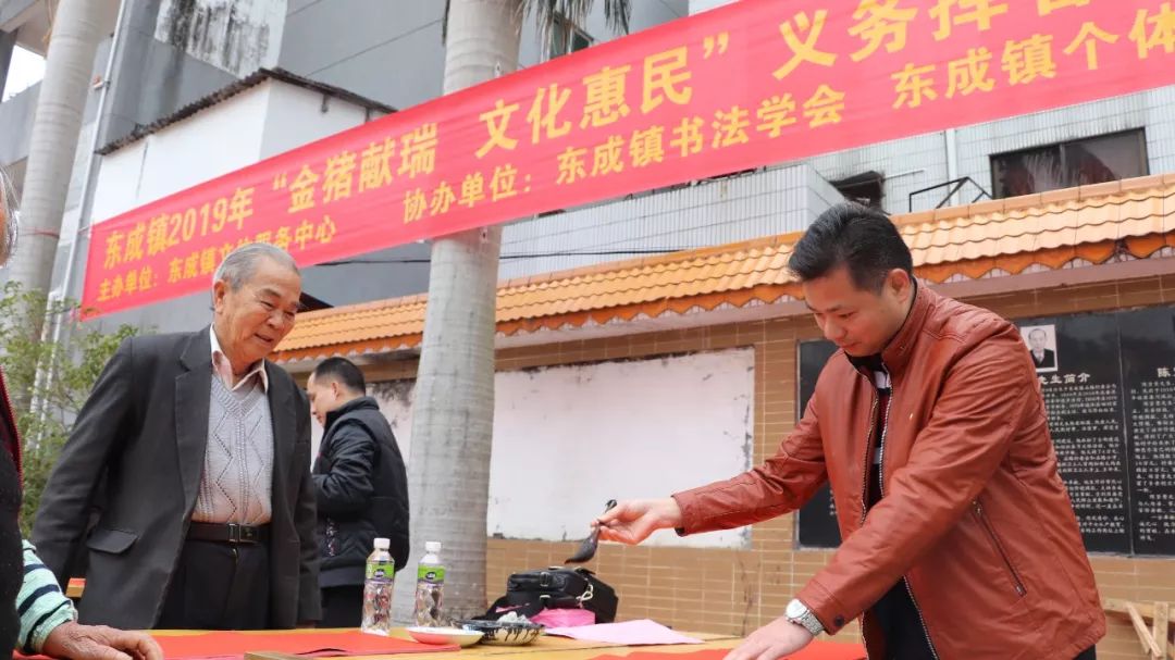 為喜迎新春,1月8日,由東成鎮(zhèn)文體服務(wù)中心主辦,東成鎮(zhèn)書法協(xié)會(huì)和個(gè)體勞動(dòng)者協(xié)會(huì)協(xié)辦的2019年“金豬獻(xiàn)瑞 文化惠民”義務(wù)揮春活動(dòng)在東成圩鎮(zhèn)僑聯(lián)廣場舉行。來自市、鎮(zhèn)兩級(jí)書法協(xié)會(huì)的16名書法家現(xiàn)場揮毫潑墨,向群眾義務(wù)書寫贈(zèng)送春聯(lián)近2000幅。