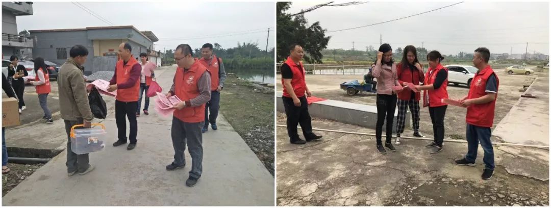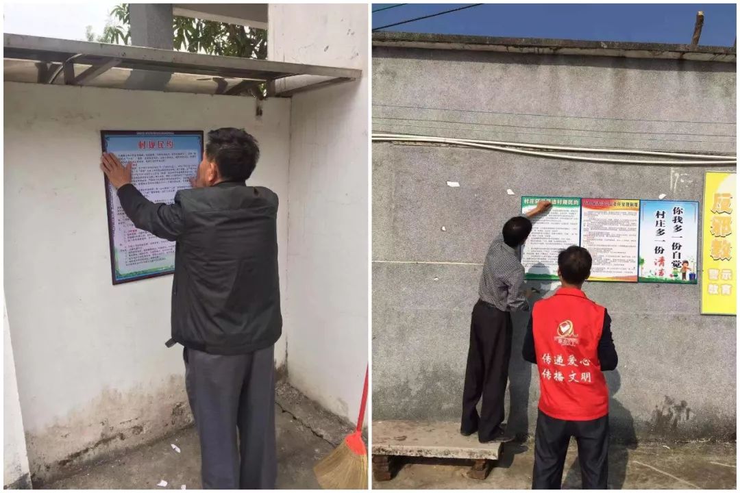 黨員義工派發(fā)宣傳單張并張貼《村規(guī)民約》