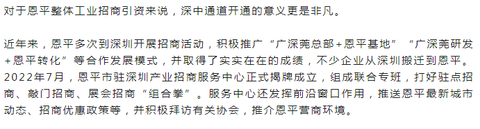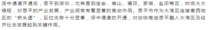 “深中通道的通車(chē),將大大提升珠江口東西兩岸的通行效率,恩平可以進(jìn)一步吸引深圳客商,對(duì)恩平加快