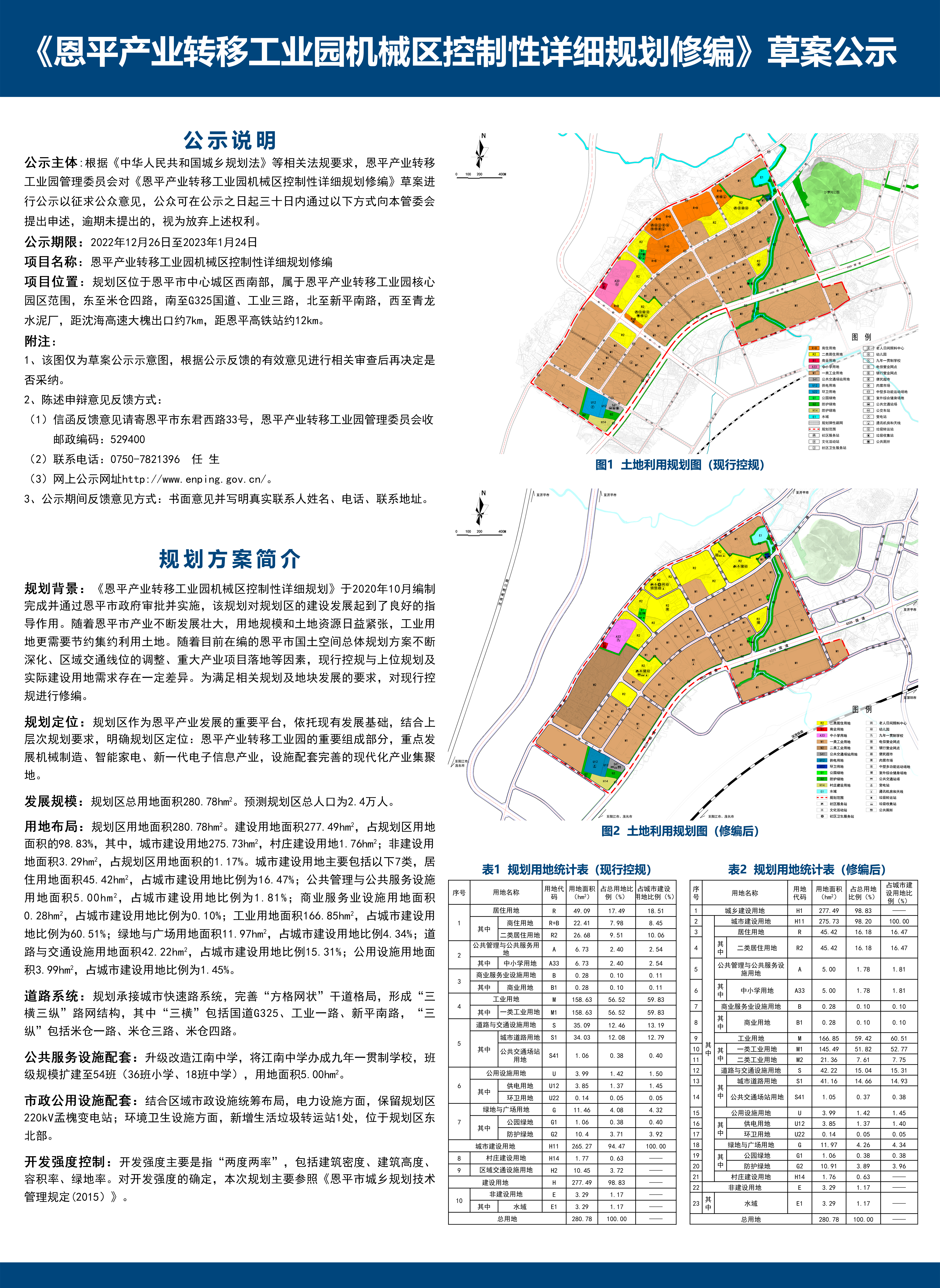公示主體:根據(jù)《中華人民共和國城鄉(xiāng)規(guī)劃法》等相關(guān)法規(guī)要求,恩平產(chǎn)業(yè)轉(zhuǎn)移工業(yè)園管理委員會(huì)對《恩平產(chǎn)業(yè)轉(zhuǎn)移工業(yè)園機(jī)械區(qū)控制性詳細(xì)規(guī)劃修編》草案進(jìn)行公示以征求公眾意見,公眾可在公示之日起三十日內(nèi)通過以下方式向本管委會(huì)提出申述,逾期未提出的,視為放棄上述權(quán)利。
